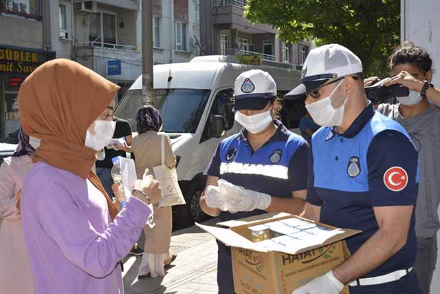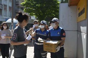 Hatay Büyükşehir Belediyesi Zabıta Daire Başkanlığına bağlı ekipler, Yükseköğretim Kurumları Sınavı’na (YKS) iren öğrencilere ve velilere maske ile su dağıttı.