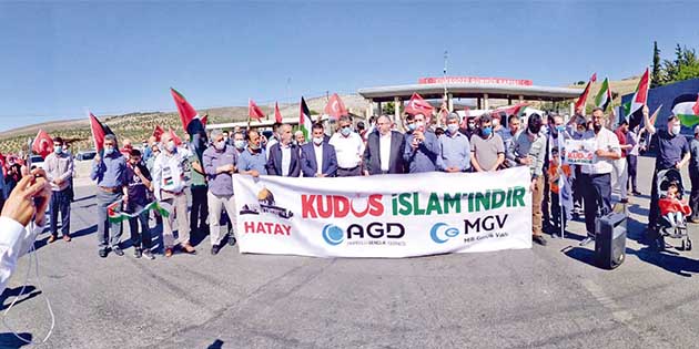 AGD ve MGV Hatay Şube Başkanı Serkan Bulut burada yaptığı açıklamada “Bugün Peygamber Efendimiz (sav)’in başlattığı kutlu yolculuğun izinden giden Hz. Ömer’in, Selahaddin Eyyubilerin, Yavuzların, Abdülhamitlerin, Hasan El Bennaların, Seyit Kutupların, Necmettin Erbakanların, Şeyh Ahmet Yasinlerin, Filistinli direniş önderlerin devam ettirdiği büyük Kudüs yürüyüşünde bayrağı teslim alma vaktidir” dedi.