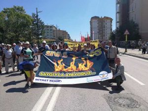 “2 Temmuz 1993 tarihinde Pir sultanı anmak üzere bir araya gelen aydınlarımız, canlarımız madımak otelinde diri diri yakıldı. Bu yılda katliamın yıldönümünde Sivas Madımak Oteli önünde yapılacak olan anma etkinliğine katıldık. Bugün Sivas’tayız.2 Temmuz 1993 yılında yapılan dünyanın en vahşi katliamını kınamak için buradayız. Sivas şehitlerini anmak için, unutturmamak için, Madımak utanç müzesi olsun diye, insanlık suçlarının zaman aşımı olmayacağını savunmak için Sivas’ta bir araya geldik.”