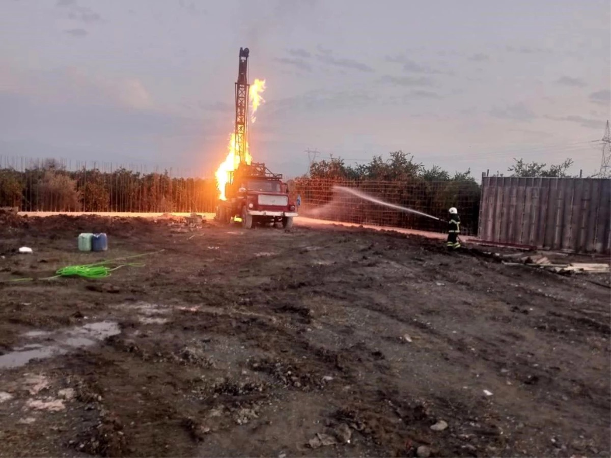 Hatay’ın Erzin ilçesinde su çıkarmak için yapılan sondaj çalışması sırasında araçta yangın çıktı.