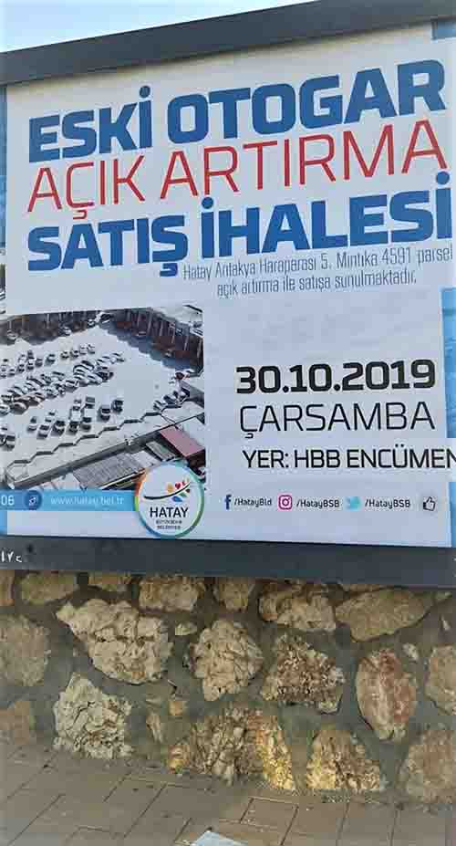 Antakya’nın bugün farklı noktalarında bulunan reklam panolarında, ‘Eski Otogar Açık Artırma Satış İhalesi. Hatay / Antakya Haraparası 5. Mıntıka 4591 parsel, açık artırma ile satışa sunulmaktadır. 30.10.2019 saat 14.00, Çarşamba, HBB Encümen Salonu…’ içeriğiyle yer alan “Eski Otogar” satış ilanı için konuştuğumuz vatandaşlar ise, kamuoyuna şu ana kadar hiç yansımamış bir bilgi paylaşımında bulundular. Bu bölgede, 5-6 ay öncesinde bir çalışma yapıldığını dile getiren vatandaşlar ve bir kısım esnaf, gelenlerin Ankara bağlantılı olduğuna işaret ederken, araştırma yapan ‘Ankara’ etiketli heyetin, Eski Otogar’ın bulunduğu alanın birçok yerinde ‘sondaj’ çalışması gerçekleştirdiğine dikkat çektiler.