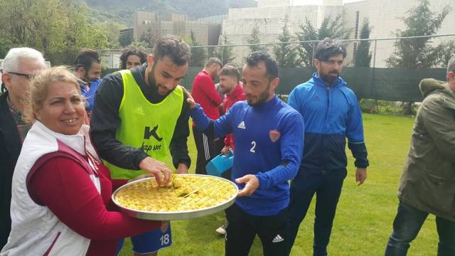 Hatayspor’un bugünkü Eyüpspor maçı öncesi son taktik çift kale maçı idmanını izleyen Hatayspor taraftarı Songül Taşdelen futbolculara sürprizde bulundu. Kısa süre önce 31 Asi Gençlik Hatayspor Taraftarlar Derneği’ni kuran Songül Taşdelen, Hatayspor idmanına eli boş gelmedi ve bir tepsi baklava ile idman sahasında futbolcuların ağızlarını tatlandırmalarına vesile oldu.-Cemil Yıldız-