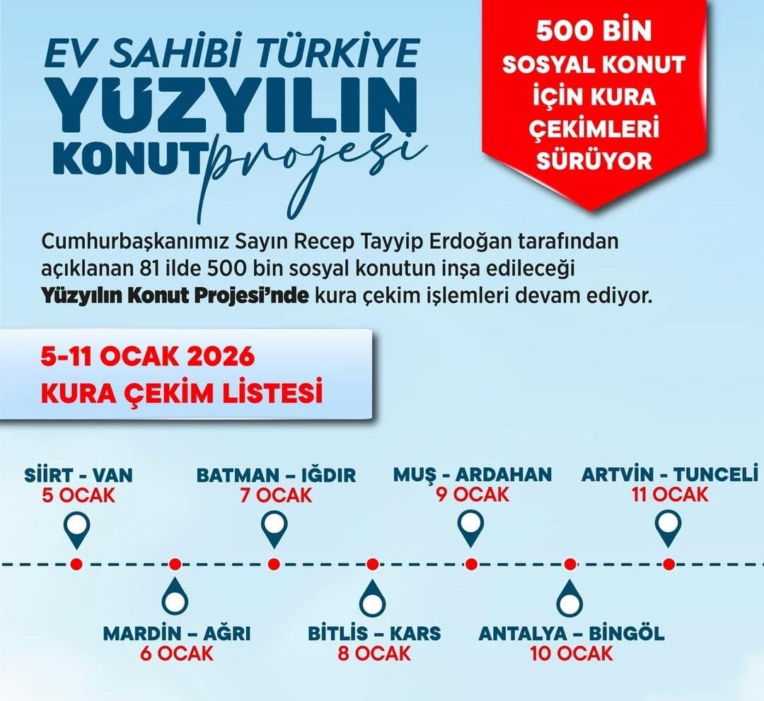 5-11 Ocak 2026 tarihleri arasında gerçekleştirilecek kura çekimleri kapsamında Siirt, Van, Mardin, Ağrı, Batman, Iğdır, Bitlis, Kars, Muş, Ardahan, Antalya, Bingöl, Artvin ve Tunceli illerinde sosyal konutların hak sahipleri belirlenecek. Kura çekimleri noter huzurunda yapılacak ve asil ile yedek listeler oluşturulacak.