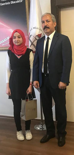 Gösterdiği bu üstün başarı dolayısıyla öğrenci Yomna Nasif’i hediye ile ödüllendiren Hatay İl Milli Eğitim Müdürü Kemal Karahan, öğrenciyi ve babası Ammar Nasif’i, tebrik etti ve öğrenciye başarılarının devamını diledi. -Cemil Yıldız-