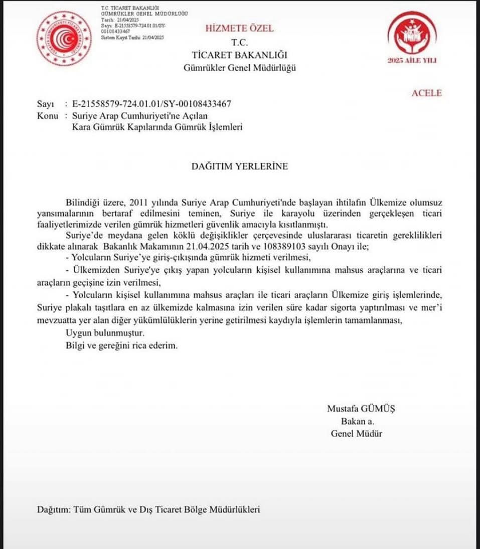 Ticaret Bakanlığı Gümrükler Genel Müdürlüğü, Suriye Arap Cumhuriyeti ile kara yolu üzerinden gerçekleştirilen ticari faaliyetlere ilişkin yeni bir düzenlemeye gitti. Bakanlık, 21 Nisan 2025 tarihli ve 108389103 sayılı onay ile yürürlüğe giren kararda, güvenlik gerekçesiyle bazı kısıtlamalar ve uygulamalara yer verdi.