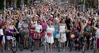 Bisiklete herkesin binebildiğini, hatta çok güzel bindiğini, o da yetmezmiş gibi süslü püslü bindiğini göstermek için, her yıl Dünya Otomobilsiz Kentler Günü’nde bir araya gelen kadınlar, bisikletleri ile meydanlara çıkıyor.