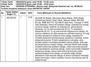 Birinci artırmanın aşağıda belirtilen gün, saat ve yerde yapılacağı ve o gün kıymetlerinin %50’sine istekli bulunmadığı taktirde, yine aşağıda belirtilen gün, saat ve aynı yerde 2. artırmanın yapılarak satılacağı; şu kadar ki, artırma bedelinin malın tahmin edilen değerinin %50’sini bulmasının ve satış isteyenin alacağına rüçhanı olan alacakların toplamından fazla olmasının ve bundan başka paraya çevirme ve payların paylaştırma giderlerini geçmesinin şart olduğu; birinci artırmadan on gün önce başlamak üzere artırma tarihinden önceki gün sonuna kadar esatis.uyap.gov.tr adresinden elektronik ortamda teklif verilebileceği, birinci artırmada istekli bulunmadığı takdirde elektronik ortamda birinci artırmadan sonraki beşinci günden başlamak üzere ikinci artırma gününden önceki gün sonuna kadar elektronik ortamda teklif verilebileceği, mahcuzun satış bedeli üzerinden aşağıda belirtilen oranda KDV.’nin alıcıya ait olacağı ve satış şartnamesinin icra dosyasından görülebileceği; gideri verildiği takdirde şartnamenin bir örneğinin isteyene gönderilebileceği; fazla bilgi almak isteyenlerin yukarıda yazılı dosya numarasıyla dairemize başvurmaları ilan olunur. 22/03/2018