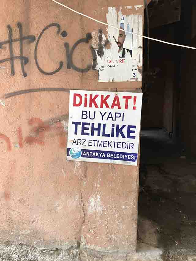 Antakya Belediyesi tarafından, yıkım tehlikesi geçiren bu iki yapının üzerine asılı ‘dikkat’ tabelaları, aynı belediye içindeki Koruma Uygulama ve Denetim Bürosu’nu akla getiriyor. Peki, görevimiz burada bitiyor mu?