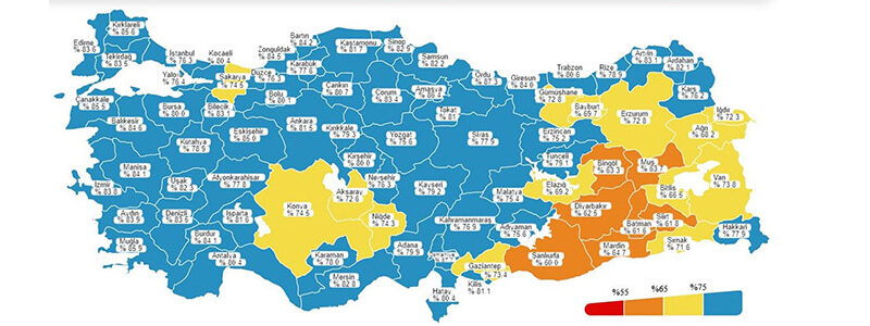 Adana: 9,25, Adıyaman: 11,07, Afyon: 53,6, Ağrı: 103,47, Aksaray: 36,64, Amasya: 28,61, Ankara: 93,11, Antalya: 27,08, Ardahan: 65,52, Artvin: 57,82, Aydın: 16,71, Balıkesir: 27,49 Bartın: 29,65, Batman: 39,5, Bayburt: 53,72, Bilecik: 52,12, Bingöl: 35,85, Bitlis: 83,76, Bolu: 109,91, Burdur: 35,19, Bursa: 43,55, Çanakkale: 40,07, Çankırı: 45,21, Çorum: 69,61, Denizli: 50,53, Diyarbakır: 57,47, Düzce: 58,63, Edirne: 12,51, Elazığ: 50, Erzincan: 69,53, Erzurum: 84,67, Eskişehir: 107,89, Gaziantep: 33,74, Giresun: 39, Gümüşhane: 57,87, Hakkari: 68,8, Hatay: 6,33, Iğdır: 16,39, Isparta: 65,18, İstanbul: 51,27, İzmir: 25,99, Kahramanmaraş: 17,29, Karabük: 36,94, Karaman: 37,66, Kars: 82,48, Kastamonu: 79,18, Kayseri: 68,52, Kırıkkale: 63,51, Kırklareli: 34,56, Kırşehir: 81,47, Kilis: 26,61, Kocaeli: 54,42, Konya: 45,82, Kütahya: 116,18, Malatya: 50,36, Manisa: 31,57, Mardin: 43,99, Mersin: 20,23, Muğla: 26,38, Muş: 63,73, Nevşehir: 39,68, Niğde: 48,89, Ordu: 55,69, Osmaniye: 6,2, Rize: 96,99, Sakarya: 59,18, Samsun: 30,97, Siirt: 43,8, Sinop: 14,78, Sivas: 84,61, Şanlıurfa: 25,39, Şırnak: 23,8, Tekirdağ: 40,61, Tokat: 79,12, Trabzon: 60,35, Tunceli: 22,77, Uşak: 36,81, Van: 51,94, Yalova: 46,01, Yozgat: 68, Zonguldak: 69,35.