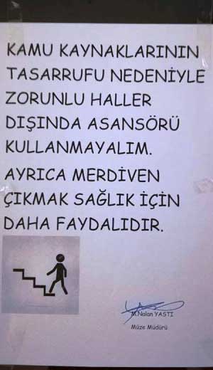 Hatay Arkeoloji Müzesi’ni ziyarete giden bir kişi tarafından fotoğraflanan bir uyarı (tavsiye) oldukça dikkat çekerken, eleştirileri de beraberinde getirdi. Müze Müdürü Nalan Yastı imzalı uyarıda (tavsiyede), gelen Müze ziyaretçilerine hitaben, “Kamu kaynaklarının tasarrufu nedeniyle, zorunlu haller dışında asansörü kullanmayalım. Ayrıca merdiven çıkmak sağlık için daha faydalıdır” mesajı yer alıyor. Halen yerinde durup durmadığı konusunda emin değiliz, ancak söz konusu kurumsal uyarıyı (tavsiyeyi) fotoğraflayan ve “Bugün Antakya Arkeoloji Müzesi’nde çektim… Kamu kaynaklarında tasarruf için ‘asansör kullanmayın’ diyor Müze Müdürü. Çok merak ediyorum, kendisi nasıl tasarruf tedbirleri almış? Mesela makam aracı ile mi gidiyor müzeye, yoksa yaya mı?” şeklinde eleştirisini paylaşan okuyucumuzun ardından, konu hakkında fikrini paylaşan son isim, eski Kültür ve Turizm Bakanı Ertuğrul Günay oldu.
