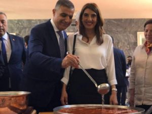 Çarşamba günü başkente giden CHP’li vekil Mehmet Güzelmansur TBMM’de kaydını yaptırıp rozetini de taktıktan sonra beraberinde götürdüğü tepsiler içindeki peynirli künefenin şiresini kendi eliyle döktü ve meclistekilere dağıttırdı. -Cemil Yıldız-