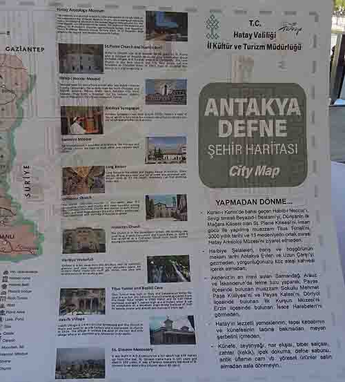 Antakya kent merkezindeki Turizm Danışma Ofisi’ne gelenleri, İl Kültür ve Turizm Müdürlüğü tarafından hazırlanan bir Antakya-Defne Şehir Haritası karşılıyor. Ama görevlinin ifadesi net! Daha günceli henüz basılmadı! Ne demek istediğini, haritaya bakınca anlıyorsunuz! Eldekinin çok da güncel olmadığını en çok da!