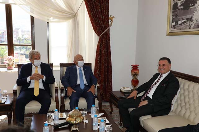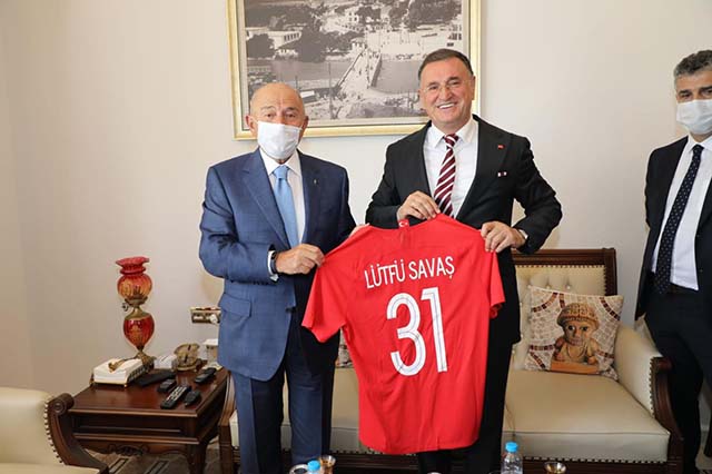 Hatayspor’a şampiyonluk kupasını vermek üzere dün sabah ilimize gelen Türkiye Futbol Federasyonu (TFF) Başkanı Nihat Özdemir ile Yönetim Kurulu üyelerinin ilk ziyaret durağı, Hatay Büyükşehir Belediyesi (BŞB) oldu. Başkan Lütfü Savaş tarafından karşılanan TFF heyetine, eski binadaki, Hatay’ın kurtuluş günlerini anımsatan salon gezdirildi ve ilimize özgü hediyeler takdim edildi. Bu arada TFF Başkanı Nihat Özdemir de Hatay Büyükşehir Belediye Başkanı Lütfü Savaş’a özel bir forma hediye etti.