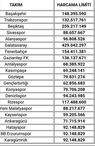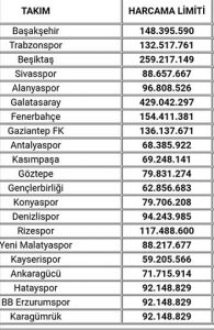 TFF’nin, Süper Lig kulüplerine uyguladığı harcama limitleri de şöyle: