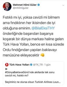 “Fıstıklı mı iyi yoksa cevizli mi bilmem ama fındıklının her ikisinden de iyi olduğuna eminim. Bilal Ekşi önderliğinde başarıdan başarıya koşarak bir dünya markası haline gelen Türk Hava Yolları, bence en kısa sürede Ordu fındığından yapılan baklavayı menüsüne ekleyecektir” yanıtını verdi. Güler’in “Fındıklı baklava” önerisine sessiz kalmayan Ekşi ise, Ordu yöresine ait bir türküden esinlenerek, “Sayın Başkanım, mesaj alındı. Yine yeşerdi fındık dalları, acep ne olacak baklavanın halları” ifadesini kullandı.