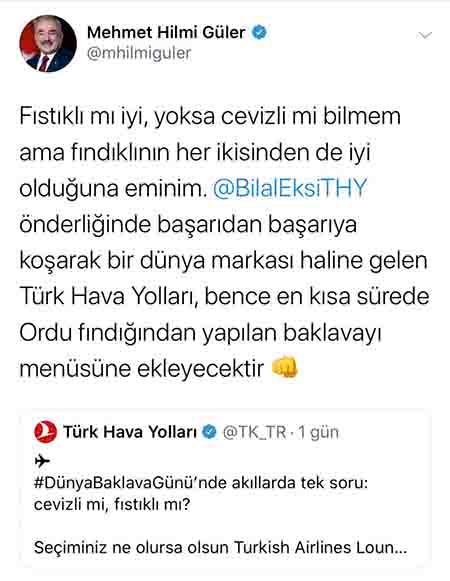 Ordu Büyükşehir Belediyesi’nden yapılan açıklamaya göre, Türk Hava Yolları (THY), 17 Kasım Dünya Baklava Günü dolayısıyla, sosyal medya hesabında, “Dünya Baklava Günü’nde akıllarda tek soru: cevizli mi, fıstıklı mı? Seçiminiz ne olursa olsun, Turkish Airlines Lounge alanlarında lezzetli baklavalarımız sizi bekliyor” mesajını paylaştı. Bunun üzerine, Ordu Büyükşehir Belediye Başkanı Mehmet Hilmi Güler, THY Genel Müdürü Bilal Ekşi’ye ithafen gönderdiği paylaşımda,