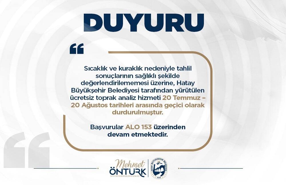 Hatay Büyükşehir Belediyesi (HBB), çiftçilere yönelik sunduğu ücretsiz toprak analizi hizmetini, hava koşullarındaki olumsuzluklar nedeniyle geçici süreyle erteledi. HBB Tarımsal Hizmetler Dairesi Başkanlığı tarafından yapılan açıklamada, son günlerde etkili olan aşırı sıcaklıklar ve kuraklık sebebiyle analiz sonuçlarının sağlıklı şekilde değerlendirilemeyeceği bildirildi.
