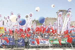 Türk-İş Genel Başkanı Ergün Atalay, alkışlarla sloganlarla desteklenen konuşmasında, tüm emekçilerin gününü kutladı, Zeytin Dalı Harekatı’nda hayatını kaybeden işçilere Allah’tan rahmet diledi.