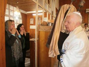 Ertesi sabah erkenden Havra’ya gittim. Kapı açıktı, içeri girdim. Antakya Musevi Havrası Cemaat Başkanı Şaul Bey ve hazanın dışında dört, beş kişi daha vardı .İnanç geleneklerine göre, bayram ibadetlerine başlayabilmek için on ergin erkeğin olması gerekirdi. Biraz daha beklediler. Azur ve Haron geldi. Daha iki kişiye gereksinimleri vardı. Ardından Yakup ve 15 yaşını henüz tamamlamış olan torunu ve dört de hanım geldi. On ergin erkeği (minyan) tamamlamışlardı . Artık ibadet hazırlıklarına başlayabilirlerdi. Hanımları, ibadethanenin bitişiğinde olan odaya aldılar. Onlar da, havranın kapısında bulunan Meduzayı öperek havraya girdiler. İçeri girerken, hanımlar eşarplarını, erkekler kipalarını (takke ) taktılar. Tallet’lerini (atkıyı anımsatan, biraz daha genişçe olan, pelerine benzer bir giysi ) giydiler. Hazanın ibadete çağrı sesi duyuldu.