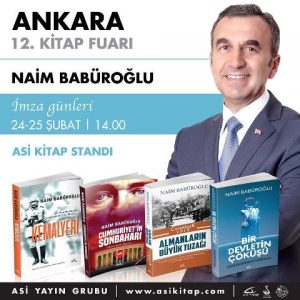 Naim Babüroğlu, bugün ve yarın saat 14.00’te Asi Kitap standında, “Kemalyeri”, “Cumhuriyetin Sonbaharı”, “Almanların Büyük Tuzağı” ve “Bir Devletin Çöküşü” adlı kitaplarını imzalayacak ve okurlarıyla sohbet edecek. Fatih Ertürk, yarın saat 14.00’te, Asi Kitap standında “Türkiye Nereye” adlı kitabını imzalayacak ve okurlarıyla sohbet edecek. Orhan Tüleylioğlu da bugün 15.30-17.30 saatlerinde Stand B-24’de “Mutluluk Konservesi” adlı kitabını imzalayıp okurlarıyla sohbet edecek. -Cemil Yıldız-