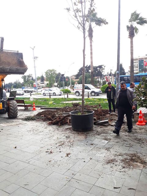 Antakya kent merkezinin insan trafiği en yoğun adreslerinden biri olan ‘Künefeciler Meydanı’nda geçtiğimiz hafta içinde dikkati çeken bir yoğunluk yaşandı. Araçlarla, kalabalık bir ekiple ve bir iş makinesi eşliğinde gelen belediye ekipleri, meydanın ‘künefeciler’ kısmının Cumhuriyet Anıtı’na bakan kısmında duran iki büyük ağacı şaşkın bakanların gözleri önünde kesti! Oldukça sağlıklı iki büyük ağacı, verdiği görselliği de hiçe sayarak iş makinesi yardımıyla yerinden parçalayarak söken ekipler, yanlarında getirdikleri iki fidanı ise kesilen diğer iki ağacın yerine ektiler.