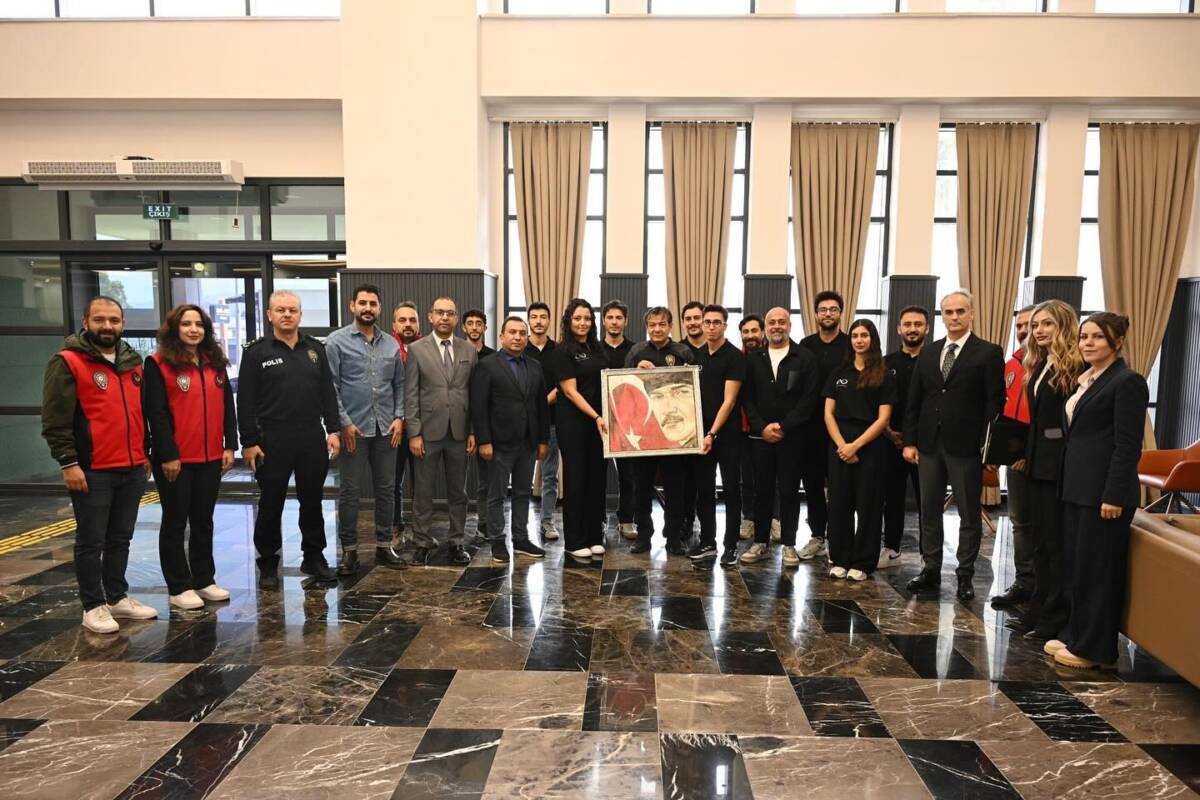Ziyarete katılan üniversiteli gençler, Emniyet Müdürü Yılmaz’a anlamlı bir jestte bulundu. Öğrenciler, yanlarında getirdikleri Türk Bayrağı ile Atatürk portresi bulunan 10 Kasım temalı tabloyu hediye ederek teşekkürlerini iletti.