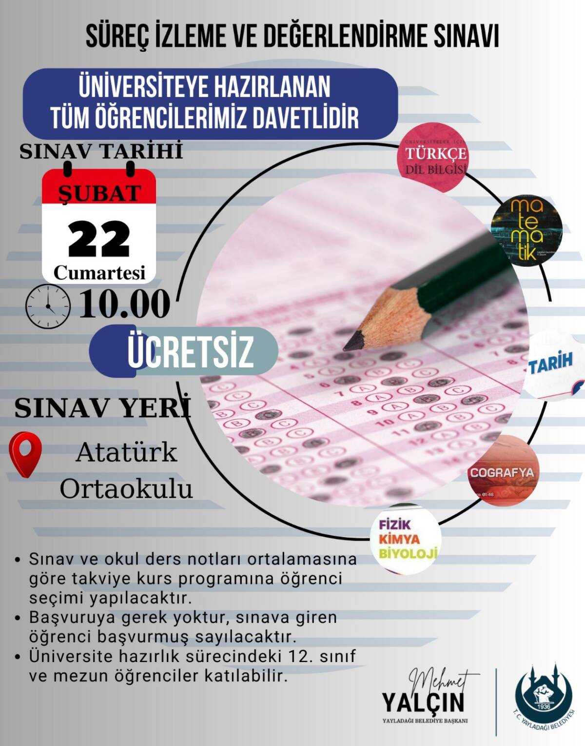 Başkan Yalçın, açıklamasında, “Üniversiteye hazırlanan tüm öğrencilerimiz davetlidir. Belediyemiz bünyesinde üniversiteye hazırlanan tüm öğrencilerimize ücretsiz süreç izleme ve değerlendirme sınavı!” ifadelerini kullandı.