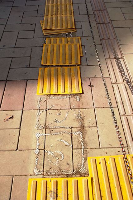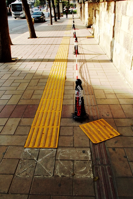 PTT binasını çevreleyen duvarın yıkılma tehlikesi nedeniyle kaldırımın önemli bir kısmını kullanım dışı bırakan dubalar, bu alanda ilerleyen ‘kılavuz’ çizgileri de