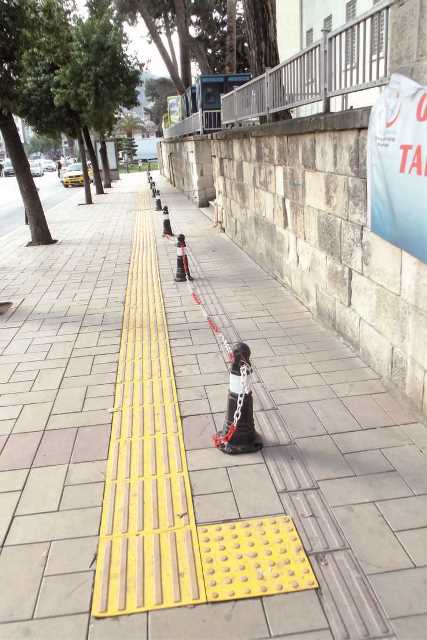 PTT binasını çevreleyen duvarın yıkılma tehlikesi nedeniyle kaldırımın önemli bir kısmını kullanım dışı bırakan dubalar, bu alanda ilerleyen ‘kılavuz’ çizgileri de kullanım dışı bırakmış durumda. Büyükşehir Belediyesi’nin çözümü ise yapılanı, yapılmak isteneni ‘sorgulatmış’… Yerel idare, mevcut çizgileri duba noktasında ‘kesmeden’ ve de ‘bitirmeden’, aynı noktaya bir de plastik bir kılavuz çizgi alanı eklemiş. Görme engelli bireyden de, bu alternatif ‘yönü’ tahmin etmesini beklemiş! Yapılan işin ‘yaptım-oldu’ kısmı mı? Yine olmamış!