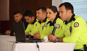 Hatay Mesleki Eğitim Kursları (HATMEK) konferans salonundaki programda, İl Emniyet Müdürlüğü ve İl Jandarma Komutanlığı trafik birimlerince, kış aylarında oluşan aşırı yağmur, sis, kar, tipi ve buzlanma gibi seyahati olumsuz yönde etkileyecek doğal unsurlar hakkında bilgi verildi.