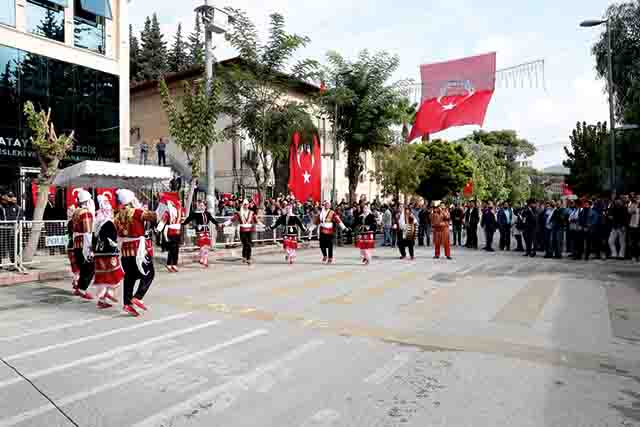 Salı günü Gündüz Caddesi’ndeki törende, daha sonra Hatay Fen Lisesi öğrencileri Dilan Berrak ve Berkay Doğru, birer şiir okudu. Tören, Hatay Büyükşehir Belediye Bandosu eşliğinde, resmi geçitle sürdü. Vali Doğan, Garnizon Komutan Vekili Piyade Komando Albay Uğur Anabal, Büyükşehir Belediye Başkanı Doç. Dr. Lütfü Savaş, geçit yapan asker ve öğrencileri ayakta selamladı. Resmi geçit töreninin ardından, kutlamalar sona erdi.-Cemil Yıldız-