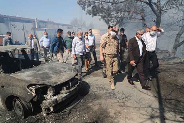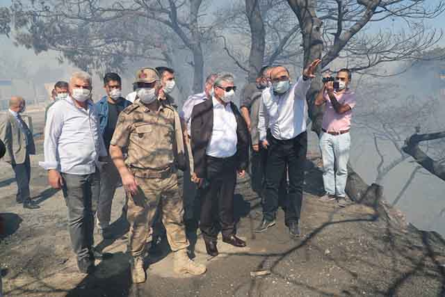 Hatay Valisi Rahmi Doğan, yangın ile ilgili söndürme çalışmalarını yerinde takip ediyor, söndürme operasyonunu yönetiyor.