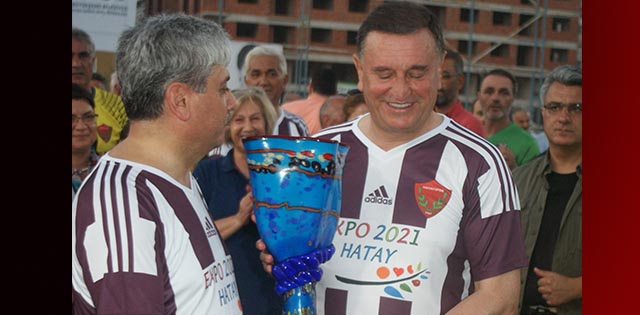 Vali Rahmi Doğan’a, ilimiz sporuna katkıları anısına, Erhan Aksay Kurumlararası Futbol Turnuvası Komitesi adına çini bir vazo hediye edildi. Turnuva finalinde forma giyerek sahada yer alan Vali Rahmi Doğan’a, Komite adına, Hatay BŞB Başkanı Lütfü Savaş tarafından çini vazo hediye edildi.