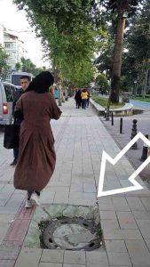 “Bu alanı gece fark etmeniz zor. Gündüz sorun olmuyor. Ama bu kaldırımları yaşlısı da kullanıyor, engellisi de, çocukları da. Bir kaldırımın orta yerine bu kadar derinlikte kapak mı konur? Hadi koydun! Bari kaldırımla aynı seviyede yap, eldekini.”