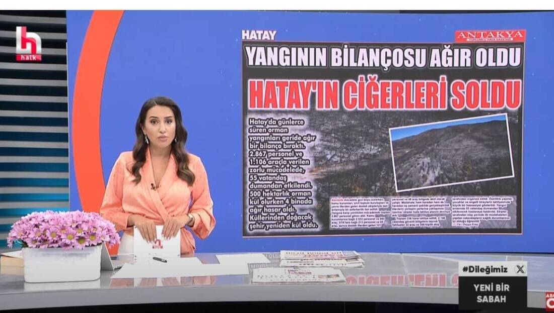 Hatay’da çıkan yangın sonrası doğa ağır yara alırken, yaşanan felaketin yankıları ulusal basına da yansıdı. Gazetemizin hazırladığı özel haber, Halk TV sabah kuşağında Gözde Şeker’in sunduğu programda geniş yer buldu.