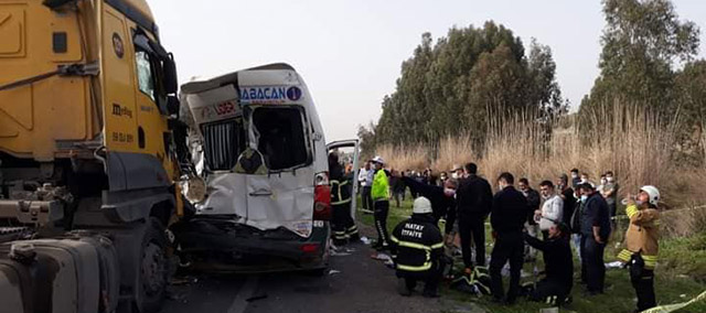 Edinilen bilgiye göre, kaza, D-817 Karayolu Yeniyurt Mahallesi Say mevkiinde meydana geldi. Dörtyol istikametinden Erzin yönüne giden, plakaları ve sürücülerinin ismi öğrenilemeyen işçi servisi minibüs, aynı istikamette gitmekte olan TIR’a arkadan çarparken, arkadan gelmekte olan bir başka TIR da duramayarak kazaya karışan minibüse çarptı.