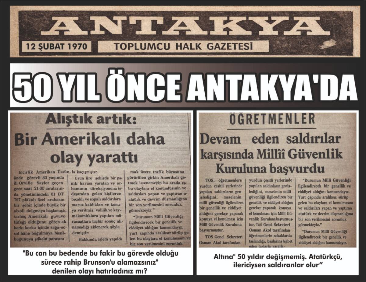 Gazetenin ilk sayfasında öne çıkan haberde, İncirlik Amerikan Üssü’nde görevli bir Amerikalının Antakya’da olay çıkardığı iddiası yer aldı. Haberde, söz konusu kişinin şehir merkezinde taşkınlık yaptığı ve kamu düzenini bozduğu öne sürüldü. Olayın ardından resmi makamların devreye girdiği belirtilirken, yaşanan gelişmelerin kentte gerginliğe neden olduğu ifade edildi.