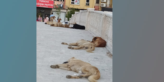 Antakya’da, Asi Nehri üzerindeki, İnönü Caddesi’ni parka bağlayan yaya köprüsü, önceki gün bir süre köpeklerin işgali altında kaldı. Çarşamba günü akşam saatlerinde aşırı sıcaktan bunalan iri köpekler, köprü üzerinde kendilerini yere bırakarak serpildi.