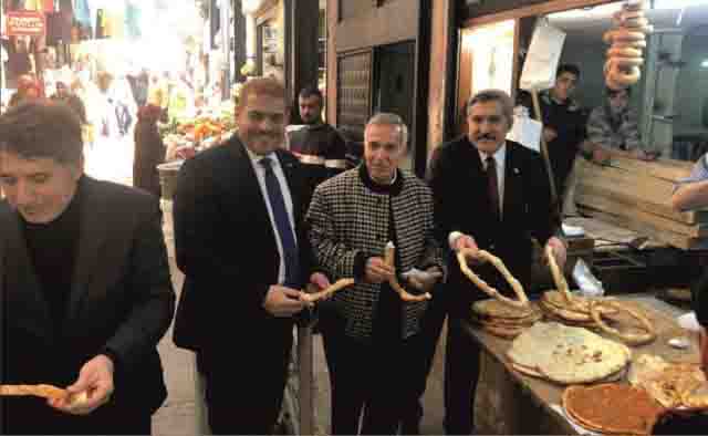 Uzun Çarşı gezisi ardından tarihi Kurşunlu Han’a geçen Donat, burada Hatay Valisi Rahmi Doğan ile bir araya geldi, beraber künefe yeme olanağı buldu. -Mehmet ÖZGÜN-