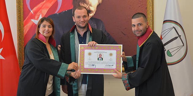 Staj dönemini başarıyla tamamlayan Yakın Doğu Üniversitesi Hukuk Fakültesi mezunu Mehmet Sabri Mursaloğlu, Antakya Adliyesi’nde düzenlenen yemin töreninde, ruhsatını Hatay Barosu Yönetim Kurulu Üyesi Av. Asena Aslan Şener’ in elinden aldı. Mehmet Sabri Mursaloğlu’na cübbesini, Yönetim Kurulu Üyesi Av. Asena Aslan Şener ve Av. Okan Atahan giydirdi. Baro Başkanı Av. Ekrem Dönmez’e temsilen törene katılan Yönetim Kurulu Üyesi Av. Asena Aslan Şener, genç meslektaşını kutladı ve başarı diledi.-Gökay Gökdemir-