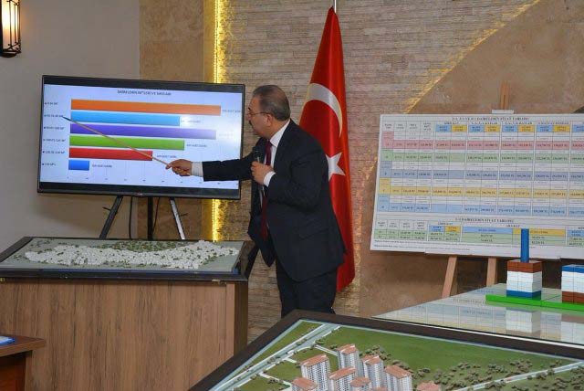 Alanımızın bir kısmını müteahhitlere, bir kısmını da hak sahiplerimize vermeyi öngördük. Amaç, hak sahiplerimizin dönüşüm alanı içinde kalarak komşularından, mahallesinden ayrılmadan yaşam kalitesinin daha yüksek olduğu bir alanda yaşamalarını sağlamak. Ayrıca Sayın Bakanımızın ifade ettiği; gerek işgalci konumundaki hak sahiplerimiz, gerek tapu tahsis belgesi sorunu olan, gerekse noter satışıyla yerini alan hak sahiplerimize de daire verebilecek, alacaklarına mükabil, enkaz bedeline mükabil, seçecekleri daire fiyatına göre tercihte bulunmalarını sağlayacağız.”