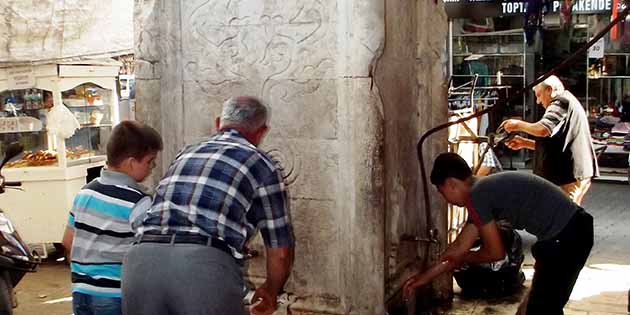 Antakya Uzun Çarşı içinde, baharatçıların ve aktarların olduğu yerden biraz yürüyüp geniş bir alana ulaştığınızda, karşınıza, dükkanların orta yerinde yükselen taş bir çeşme çıkıyor. Kimi 100 yaşında dese de, çoğunluk ‘100’den çok fazla’ konusunda ısrarcı. Ama yorgun bedenine dair yaş tartışmasına sizi asıl sokan şey, çeşmeye dair gördükleriniz.
