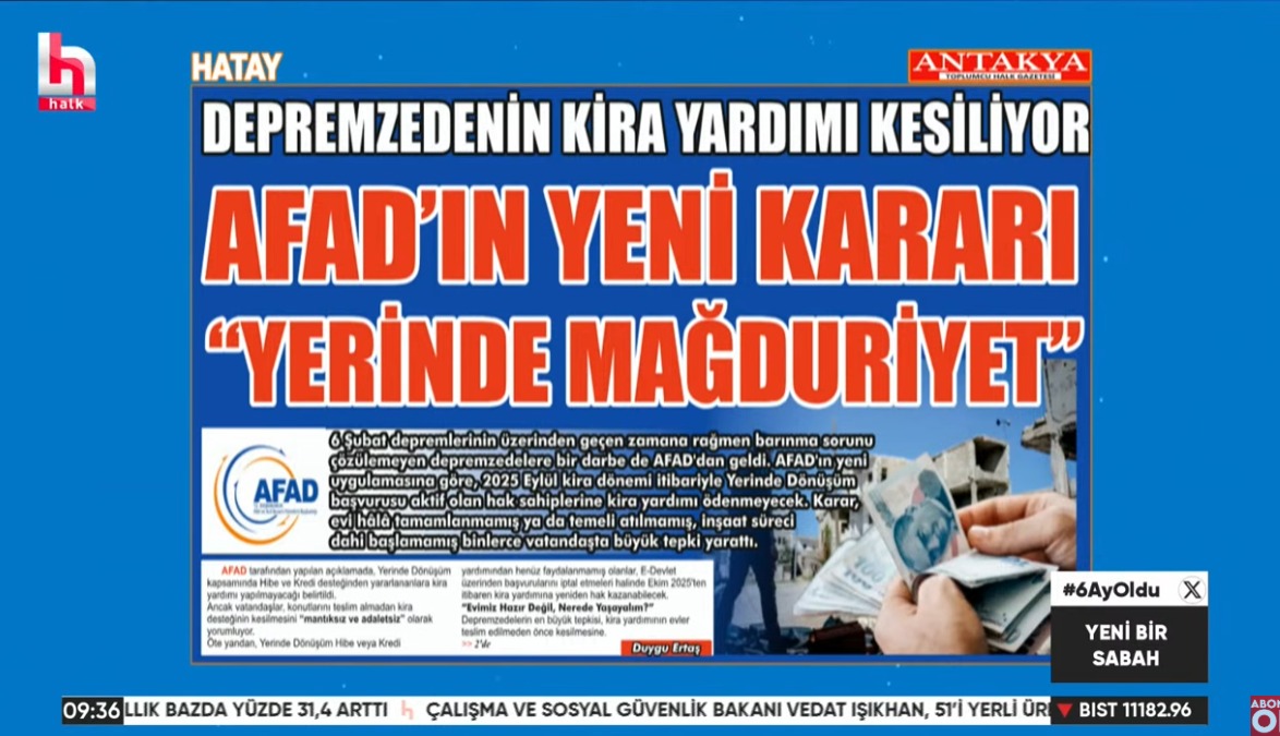 Halk TV ekranlarında Gözde Şeker’in hazırlayıp sunduğu Yeni Bir Sabah programında gazetemizin manşeti gündeme taşındı. “AFAD’ın yeni kararı: Yerinde Mağduriyet” başlığıyla yayımlanan haberimizde, yerinde dönüşüm başvurusu yapan depremzedelerin kira yardımlarının kesilmesi sonucu yaşadıkları sıkıntılar ele alınmıştı.