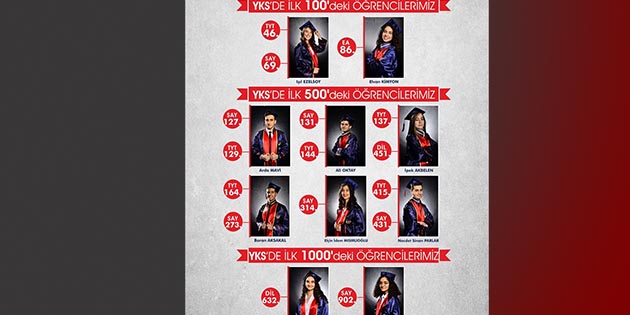 Geçtiğimiz hafta sonunda sonuçları açıklanan Yükseköğretime Giriş Sınavı’nda ilimiz TED Koleji önemli bir başarı elde etti. TED Yönetimi bilgilerine göre, okuldan 2 öğrenci Türkiye’de ilk 100 kişi arasına girerken, ilk 500 kişi arasına da 6 öğrenci girmeyi başardı. TED Hatay Koleji verilerine göre, YKS’da ilk 100’e giren 2 öğrenci şunlar: