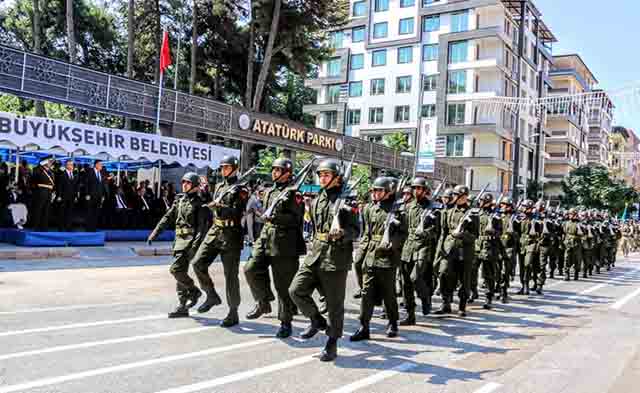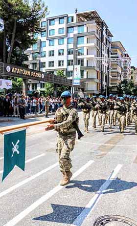 Kutlamaların bundan sonraki bölümü ise Gündüz Caddesi’nde gerçekleşti. Köprübaşından, park önü ve ileriye kadar uzanan tören alanında konuşmalar yapılırken; Vali, Garnizon Komutanı ile BŞB Başkanı birlikte jeepe bindi ve törene katılanlar ile halkın bayramını kutladı. Törende ayrıca Askerler, Gaziler ile öğrencilerin geçit resmi gerçekleşti. Günün anlamına uygun, TSK’yı temsilen bir konuşma da yapılırken, dün gece, Valilik bahçesinde 30 Ağustos Zafer Bayramı Resepsiyonu verildi.