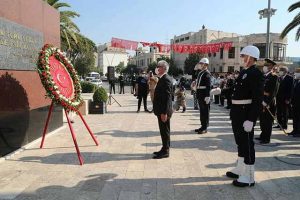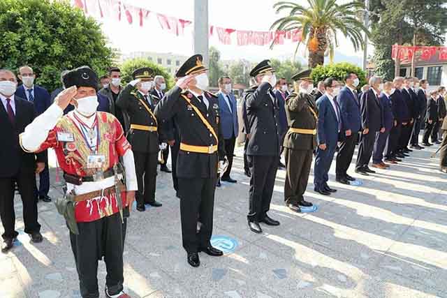 Bugün sabah 09.00’da, Atatürk Anıtı’ndaki törende; Vali Rahmi Doğan, Garnizon Komutanı ve Hatay Büyükşehir Belediyesi Vekili Fedai Yücedal, Anıt’a çelenk takdim etti ve saygı duruşunda bulunuldu. Dün sabah, Kovid önlemleri kapsamında, sosyal mesafeli olarak, protokol üyeleri ve diğer katılımcılar Anıt’taki yerlerini alırken, Vali Rahmi Doğan, Anıt Şeref Defteri’ne yazdığı mesajında, 30 Ağustos’un, dünya tarihinin en büyük kahramanlık destanlarından biri olduğu vurgusunu yaptı.