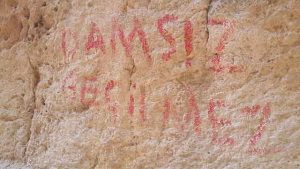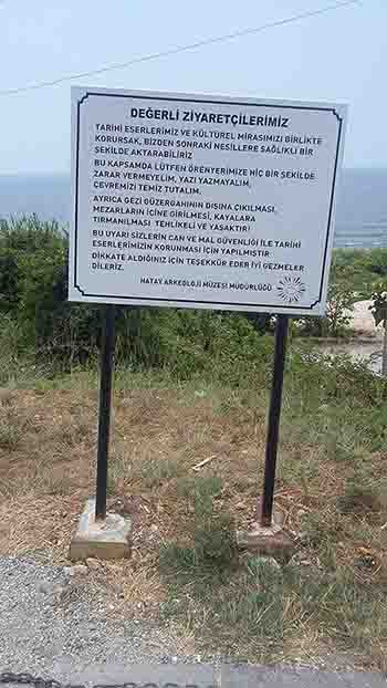Beşikli Mağarası öncesinde gelenleri karşılayan bir diğer uyarı tabelası ile de ‘olması gerekenin’ altını çizen Hatay Arkeoloji Müzesi Müdürlüğü’ne şunu sormak gerekiyor aslında! Daha önce, Beşikli Mağarası’nın ön cephesinde yer alan ahşap çit neden tekrar yerine konulmadı? Ziyaretçilerin durmaları gereken yer konusunda ‘sınır çizgisi’ görevi gören uygulama neden devreden çıkarıldı? Zira eldeki görüntü, ne yazık ki, gelen kalabalıkların mezarlar üzerinde ‘selfie’ çekme yarışına şahitlik etmenin ötesine geçmiyor.