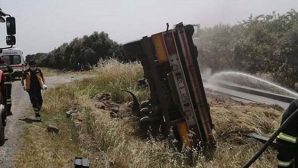 Devrilen tırda çıkan yangın, itfaiye ekipleri tarafından söndürüldü. Mehmet ÖZGÜN