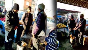Sabahın 06:00’sından itibaren ayazda tezgahlarını kurmaya başlayan pazarcılar, soğuk hava nedeniyle oldukça mağdur olduklarını bildirdi, güç koşullarda çalışmak zorunda kaldıklarını ifade etti. Isınabilmek için teneke kutular içinde sebze ve meyve kasalarını yakan ve ateşin etrafında toplanan pazarcılar, biraz da olsa ısınabilmenin keyfini çıkarmaya çalışıyor.